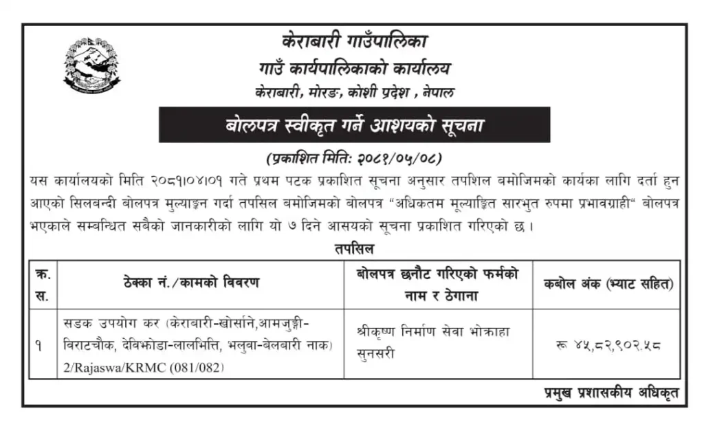 Kerabari – Miti 2081/04/01 gate pratham patak prakashit suchana anusar tapasil bamojim ko karya ka lagi darta hun aayeko silbandi bolitapatra mulyaankan garda tapasila bamojim ko bolitapatra “adhiktam mulyaankit sarabhut rupma prabhavgrabi” bolitapatra bhayekale sambandhit sabai ko jankari ko lagi yo 7 dine asay ko suchana prakashit gareko cha.